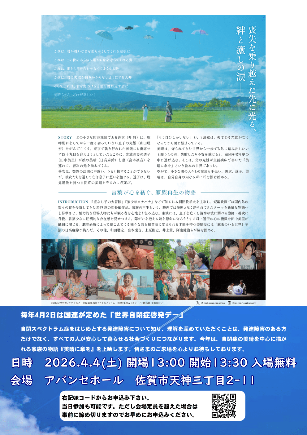 佐賀県自閉症協会では、世界自閉症啓発デーの取り組みとして無料映画上映会の開催を予定しております。