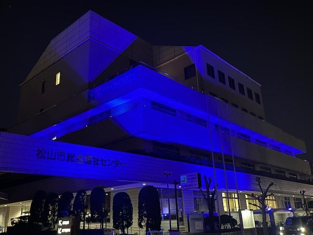 ブルーライトアップは、愛媛県庁ドーム、松山市総合福祉センター、今治市公会堂、今治国際ホテル、えんとつ山(新居浜市)、西条市役所新館、四国中央市子ども若者発達支援センター「パレット」、大久展望台(伊方町)の8か所で、4月2日(木)~4月8日(水)の間、ライトアップされました。