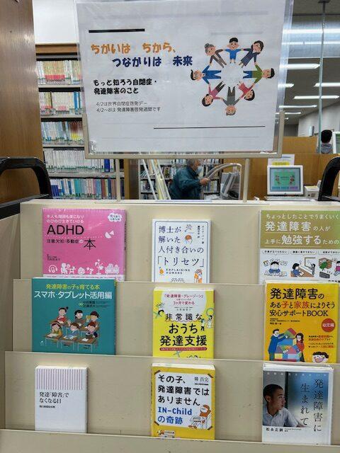 市役所展望ロビーでの自閉症児者による作品展や市内各所のブルーライトアップに加え、川崎市各区の図書館で関連書籍の特集展示も実施。